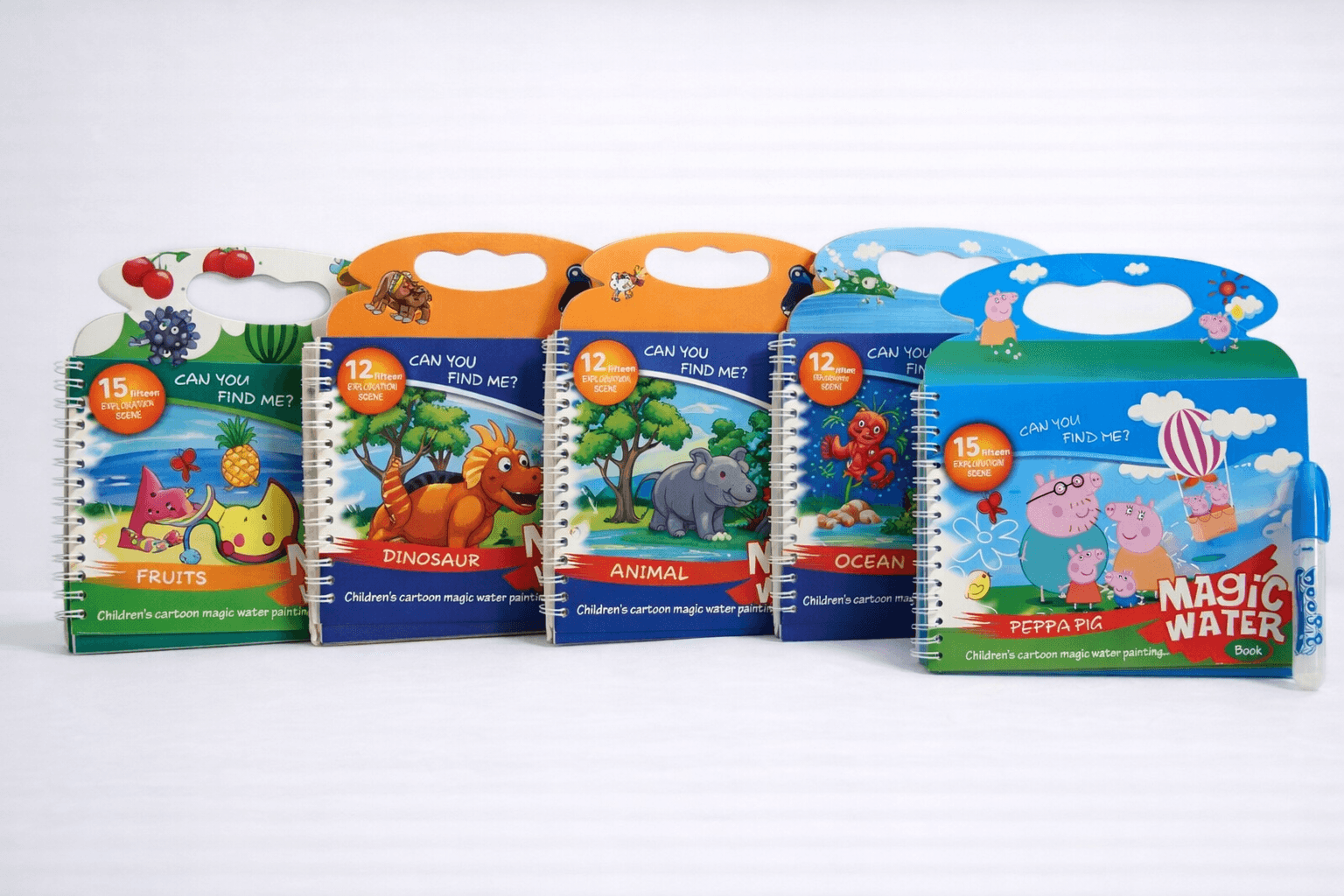 The Busy Book encourages structured learning through matching and recognition activities, while the Magic Water Book promotes creativity in a safe and mess-free way.