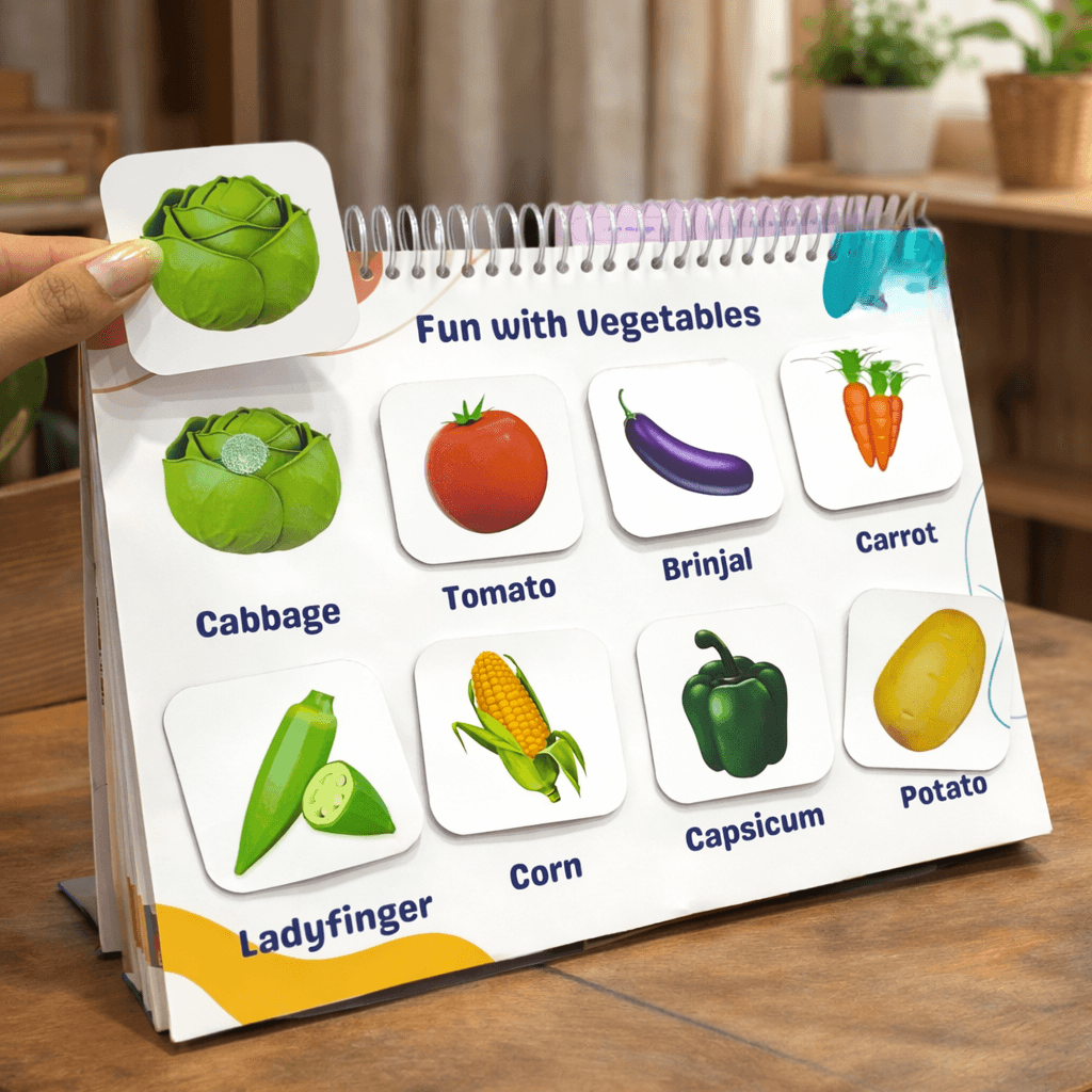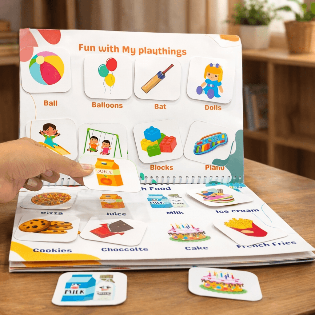 An interactive activity book featuring reusable velcro pieces across multiple learning categories.