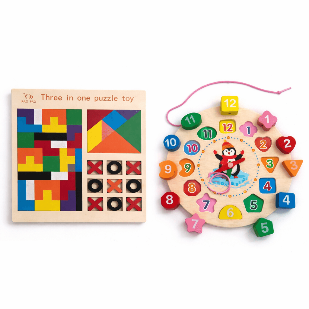 Includes: Wooden Learning Clock + 3-in-1 Puzzle Board